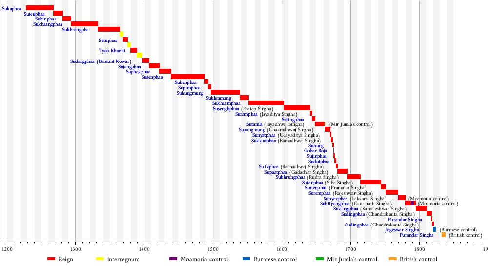 1811–1818 | 17س | Sudingphaa (1) | Chandrakaanta Singha | brother of Suklingphaa | deposed[23] | Jorhat |