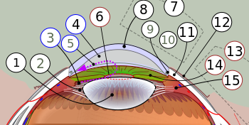 1. العدسات، 2. النطيقة الهدبية، 40. الغرفة الأمامية و5. تدفق الخلط المائي؛ حدقة، 7. الغلالة الليفية و8. القرنية، 9. الشبكة التربيقية وقناة شليم. 10. حوف القرنية و11. الصلبة؛ 12. الملتحمة، 13. العنبية و14. القزحية، 15. الجسم الهدبي.