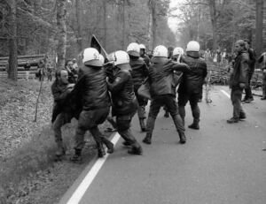 In 1981, Germany's largest anti-nuclear power demonstration protested against the construction of the Brokdorf Nuclear Power Plant west of Hamburg. Some 100,000 people came face to face with 10,000 police officers.[127][135][136]