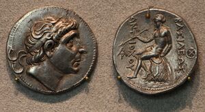 عملة أنطيوخوس الثاني. الكتابة اليونانية تقول: ΒΑΣΙΛΕΩΣ أنطيوخوي (الصفة من أنطيوخوس).
