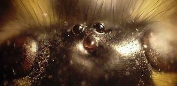 Head of a wasp with three ocelli (center), and compound eyes at the left and right