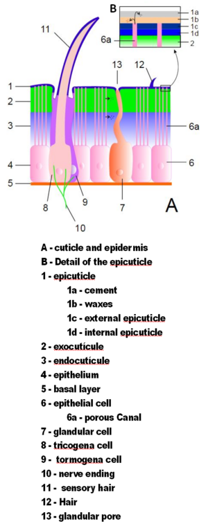 Arthropod exoskeletons are made of cuticle, a non-cellular material secreted by the epidermis.[25] Their cuticles vary in the details of their structure, but generally consist of three main layers: the epicuticle, a thin outer waxy coat that moisture-proofs the other layers and gives them some protection; the exocuticle, which consists of chitin and chemically hardened proteins; and the endocuticle, which consists of chitin and unhardened proteins. The exocuticle and endocuticle together are known as the procuticle.[40] Each body segment and limb section is encased in hardened cuticle. The joints between body segments and between limb sections are covered by flexible cuticle.[25]