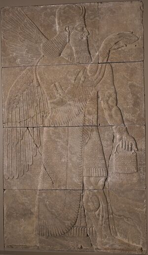 Ashurnasirpal II's palace in Kalhu (Nimrud, which is in modern-day Iraq slightly south of Mosul) probably began construction c.878 BC,[8] and is now generally accepted as having been completed after around 15 years alongside the near-total reconstruction of the Middle Assyrian city, c.864 BC.[9][10] An inscription describing its inauguration details a ten-day banquet which 69,574 people attended.[11] The palace walls were lined with reliefs carved in alabaster. These reliefs bore elaborate carvings, many portraying the king surrounded by winged protective spirits, or engaged in hunting or on campaign.