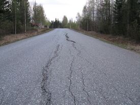 Asphalt deterioration can include crocodile cracking, potholes, upheaval, raveling[مطلوب توضيح], bleeding, rutting, shoving, stripping,[مطلوب توضيح] and grade depressions. In cold climates, frost heaves can crack asphalt even in one winter. Filling the cracks with bitumen is a temporary fix, but only proper compaction and drainage can slow this process.