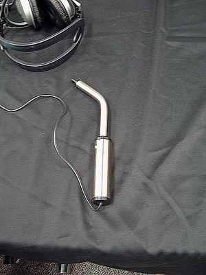 This voter with a manual dexterity disability is making choices on a touchscreen with a head dauber