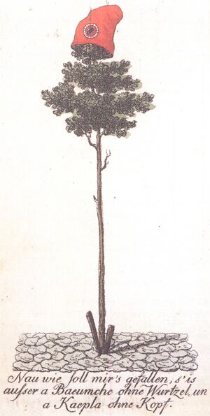 A tree of liberty topped with a Phrygian cap set up in Mainz in 1793. Such symbols were used by several revolutionary movements of the time.