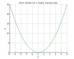 are 1 and 1 respectively and the correct output, t is 0. Now if the relation is plotted between the network's output y on the horizontal axis and the error E on the vertical axis, the result is a parabola. The minimum of the parabola corresponds to the output y which minimizes the error E. For a single training case, the minimum also touches the horizontal axis, which means the error will be zero and the network can produce an output y that exactly matches the target output t. Therefore, the problem of mapping inputs to outputs can be reduced to an optimization problem of finding a function that will produce the minimal error.
