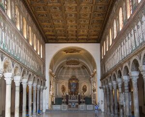 Its apse and atrium underwent modernization at various times, beginning in the 6th century with the destruction of mosaics whose themes were too overtly Arian or which expressed the king's glory, but the mosaics of the lateral walls, twenty-four columns with simplified Corinthian capitals, and an Ambo are preserved. On some columns, images of arms and hands can be seen, which are parts of figures once representing praying Goths and Theodoric's court, deleted in Byzantine times.[2] Renovations (and alterations) were done to the mosaics in the mid-19th century by Felice Kibel. The present apse is a reconstruction after being damaged during World War II.