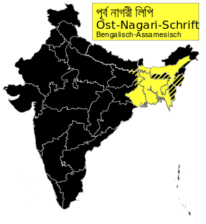 The Bengali–Assamese script,[5] sometimes also known as Eastern Nagri,[6] is an eastern Brahmic script, primarily used today for the Bengali and Assamese language spoken in eastern South Asia. It evolved from Gaudi script, also the common ancestor of the Odia and Trihuta scripts.[7][8] It is commonly referred to as the Bengali script by Bengalis[9] and the Assamese script by the Assamese,[10] while in academic discourse it is sometimes called Eastern-Nāgarī.[11] Three of the 22 official languages of the Indian Republic—Bengali, Assamese, and Meitei[أ][12]—commonly use this script in writing;[13][14][15] Bengali is also the official and national language of Bangladesh.