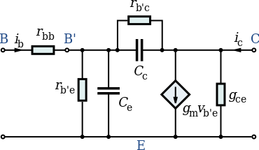 As shown, the h-parameters have lower-case subscripts and hence signify AC conditions or analyses. For DC conditions they are specified in upper-case. For the CE topology, an approximate h-parameter model is commonly used which further simplifies the circuit analysis. For this the hoe and hre parameters are neglected (that is, they are set to infinity and zero, respectively). The h-parameter model as shown is suited to low-frequency, small-signal analysis. For high-frequency analyses the inter-electrode capacitances that are important at high frequencies must be added.