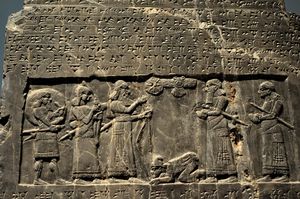 The stele describes how Jehu brought or sent his tribute in or around 841 BC.[10] Jehu severed Israel’s alliances with Phoenicia and Judah, and became subject to Assyria. The caption above the scene, written in Assyrian cuneiform, can be translated: