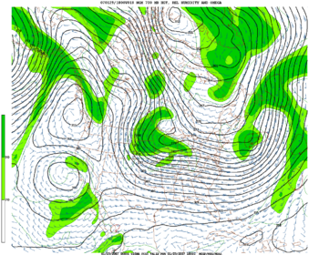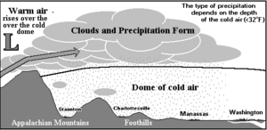 When warm air ahead of an oncoming storm system overrides cool air trapped east of a mountain range, cloudiness and precipitation can occur for prolonged periods of time