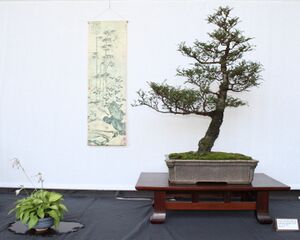 Indoors, a formal bonsai display is arranged to represent a landscape, and traditionally consists of the featured bonsai tree in an appropriate pot atop a wooden stand, along with a shitakusa (companion plant) representing the foreground, and a hanging scroll representing the background. These three elements are chosen to complement each other and evoke a particular season, and are composed asymmetrically to mimic nature.[16] When displayed inside a traditional Japanese home, a formal bonsai display will often be placed within the home's tokonoma or formal display alcove. An indoor display is usually very temporary, lasting a day or two, as most bonsai are intolerant of indoor conditions and lose vigor rapidly within the house.[بحاجة لمصدر]
