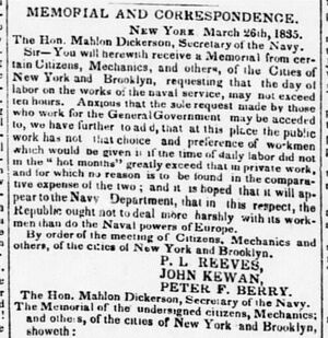 Early Brooklyn Navy Yard mechanics and laborers were per diem employees, paid by the day. As per diem employees they were rarely in a position to negotiate wages. Commodore Isaac Chauncey writing to the Secretary of the Navy Robert Smith on January 5, 1808, declared "I however was able to find a sufficient number willing to work at the reduced wages and these who refused will in a week come back and beg for work and I shall be able to reduce their wages 25 cents more for the merchants have no work for them to do, therefore, they must either work for us at our price or go unemployed to induce the merchants to believe the government is not fully determined to build the twenty three Gun Boats at this place I have given out that they are to be built where they can be built cheapest..."[42] Wages fluctuated significantly based on the congressional apportionment for that year. For example in May 1820, the Board of Navy Commissioners, directed Captain Samuel Evans, the pay of shipyard carpenters was to be reduced 1.62 1/2 cents per day to 1.25 per day, likewise laborers pay was reduced from 90 cents per day to 75.[43] The Brooklyn Navy Yard soon became a large employer because of the expansion of shipbuilding. 1835 was an important year for American labor, with workers in major Northeastern cities petitioning for higher wages; better working conditions, and a ten-hour workday. On March 26, 1835, the mechanics in the New York Navy Yard petitioned the Board of Navy Commissioners to reduce the workday to ten hours, which was "signed by one thousand citizens of New York and Brooklyn." On April 24, 1835, the Board, rejected their petition, because "it would be inconsistent with the public interests, to regulate the working hours in the Navy Yards as proposed in the memorial".[44] The ten-hour workday would not be implemented until March 31, 1840, when President Martin Van Buren finally mandated a ten-hour workday for all mechanics and laborers employed on public works."[45] In 1848, the yard had 441 employees who typically worked a ten hour day, six days a week.[46]