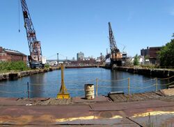 In February 1966, the federal government announced that the Brooklyn Navy Yard was eligible for around $10 million in aid to help convert the yard into an industrial park.[164] The state's bipartisan congressional delegation began negotiations with the federal government to receive this aid.[165] Soon afterward, the city announced plans to purchase the yard and convert it into an industrial complex,[166] despite challenges from several federal agencies who also wanted to use parts of the yard.[167] In July 1966, the city moved to purchase the Brooklyn Navy Yard.[168][169][170]