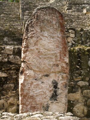 The earliest legible texts referring to the kings of the Kaan dynasty come from excavations of the large city of Dzibanche in Quintana Roo, far north of Calakmul.[27] A hieroglyphic stairway depicts bound captives, their names and the dates they were captured together with the name of king Yuknoom Che'en I, although the exact context of the king's name is unclear - the captives may have been his vassals captured by an enemy or they may have been rulers captured by the king of Calakmul. The dates are uncertain but two of them may fall within the 5th century AD.[27] The nearby Quintana Roo site of El Resbalón has a jumbled hieroglyphic text, including a date in 529, that indicates that the city was within the control of the Kaan dynasty.[30]