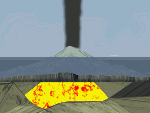تصبح غرفة الصهارة فارغة كليا أو جزئيا، بعد الثورة العنيفة التي تندفع فيها أحجام كبيرة من الصهارة من غرفة الصهارة المتواجدة على بعد عدة كيلومترات قليلة تحت مخرج البركان، ثم يهبط ببطء سقف غرفة الصهارة غير المدعم تحت تأثير وزنها وينهار من خلال حلقة من الكسور الرأسية شديدة الأنحدار، تاركا منخفضا كبيرا على شكل حوض، أكبر بكثير من فوهة البركان، يسمي كالديرا.