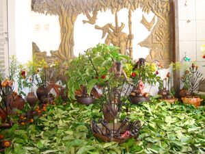 The floor of the terreiro is deemed sacred, consecrated to the tutelary orixá of the house.[197] The terreiro will often have a cumeeira, a central pole in the structure believed to link humanity's world with that of the orixás.[198] This stands above the entoto ("foundation") of the terreiro,[199] a space periodically "fed" with offerings.[200] An outdoor enclosure may have a tree dedicated to Tempo,[201] shrines to forest orixás like Oxossi and Ogun,[202] and a balé, a place set aside for the souls of the dead.[203] Plants used in rituals may also be grown in this outdoor area.[202]
