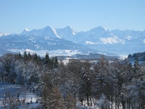 The Bernese Alps with Eiger, Mönch and Jungfrau, view from Gurten, Bern in Winter