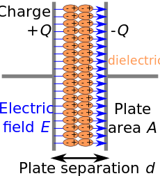 يتسبب عزل لوحي المكثف المشحون في توليد مجال كهربائي بينهما . الشحنة السالبة -Q على اللوح A والشحنة الموجبة +Q على اللوح الآخر .