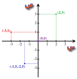 صورة. 1 - نظام الإحداثيات الديكارتية. 4 نقاط: (2,3) بالأخضر، (-3,1) بالأحمر، (-1.5,-2.5) بالأزرق، (0,0)، الأصل، بالبنفسجي.