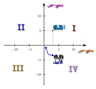يحدد تقاطع المحورين أربع مناطق، يشار إليها بالأرقام الرومانية I (+,+) وII (−,+) وIII (−,−) وIV (+,−). اتفاقا، ترقم هذه المناطق عكس عقارب الساعة ابتداءا من المنطقة اليمنى العليا. في المنطقة الأولى، تكون كلا الإحداثيتين موجبتين، أما في الثانية، فتكون إحداثية السين سالبة وإحداثية الصاد موجبة، أما في المنطقة الثالثة تكون كلاهما سالبتين، وأخيرا في المنطقة الرابعة تكون إحداثية السين موجبة وإحداثية الصاد سالبة.(انظر الصورة 3).