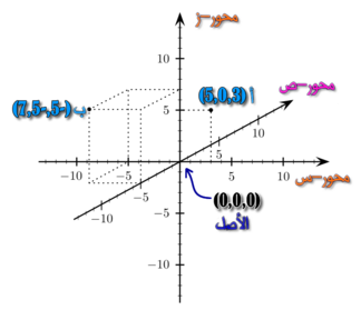 تكون الإحداثيات في النظام الثلاثي الأبعاد على شاكلة (س،ص، ز). وعلى سبيل المثال، تم تصوير نقطتين في نظام الصورة 4، النقطة أ(3،0،5) والنقطة ب(-5،-5،7).