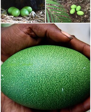 The cassowary breeding season starts in May to June. Females lay three to eight large, bright green or pale green-blue eggs in each clutch into a heap of leaf litter prepared by the male.[29] The eggs measure about 9 في 14 cm (3.5 في 5.5 in) – only ostrich and emu eggs are larger.