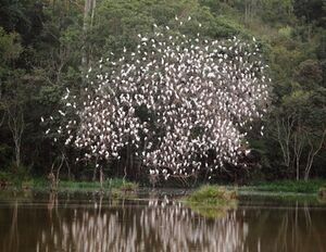 The cattle egret nests in colonies, which are often found around bodies of water.[23] The colonies are usually found in woodlands near lakes or rivers, in swamps, or on small inland or coastal islands, and are sometimes shared with other wetland birds, such as herons, egrets, ibises, and cormorants. The breeding season varies within South Asia.[8] Nesting in northern India begins with the onset of monsoons in May.[42] The breeding season in Australia is November to early January, with one brood laid per season.[43] The North American breeding season lasts from April to October.[23] In the Seychelles, the breeding season of B.i. seychellarum is April to October.[44]