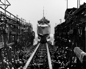Thousands of ships of every description came off the ways during World War II, the concerted effort of a mobilized American industry. The historic christening and launching ceremonies continued, but travel restrictions, other wartime considerations, and sheer numbers dictated that such occasions be less elaborate than those in the years before the war.[2]