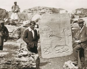 من اليمين إلى اليسار: ليونارد وولي ومساعده لورانس العرب يقفان أمام لوح من عصر الحيثيين في أثناء عملية التنقيب في كركميش في سورية بين عامي 1911 و1914