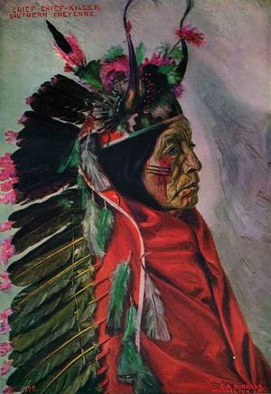 Painting of chief Chief Killer, a Southern Cheyenne war chief, wearing society headdress. Painted by E.A Burbank, 1899.