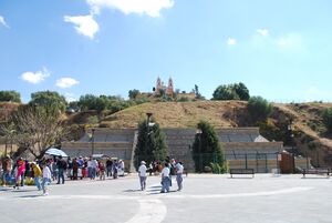 The pyramid was a place of pilgrimage in the pre Hispanic period, and it is a place of pilgrimage today, to visit an image known as the Virgin of the Remedies, especially in September.[16] The Virgin of the Remedies is a variation of the Virgin Mary specifically dedicated to the needs of the poor.[29] Veneration of this Virgin in Mexico dates back to the Conquest, with various stories surrounding how this particular manifestation became associated with the Spanish conquest of the Aztec Empire. Most revolve around a conquistador by the name of Juan Rodríguez de Villafuerte. One story states that he brought this image with him before leaving for the New World by a soldier who had fought in Italy.[30] Another states that she was carried by Villafuerte, but lost during the Noche Triste only to be found later by a local indigenous man.[31] Yet another states that an image of this Virgin appeared on the sleeve of Franciscan friar Martín de Valencia, while praying on the pyramid mound of Cholula.[32] The Virgin of the Remedies is strongly associated with the Conquest as the protector of the conquistadors. She was made a "general" of the Spanish army in their battles against the indigenous of New Spain. During the Mexican War of Independence, she was invoked by royalist forces, while the insurgents carried the banner of the Virgin of Guadalupe. For this reason, this image is also called the Virgen Gachupina, as "gachupina" is a derogatory word for the Spanish used in Mexico.[33] The Virgin of the Remedies was one of four Virgin Mary images which were used to substitute for pre Hispanic female deities in the cardinal directions from Mexico City. This one was placed in the east, with the Virgin of Guadalupe to the north, the Virgin of Mercy to the south and the "Virgen de la Bala" to the south.[34] There is a story that a serpent lives beneath the pyramid. It is likely related to the myth of Quetzalcoatl, the feathered serpent, which was converted to the snake, related to the devil and crushed under the foot of the Virgin Mary.[35]