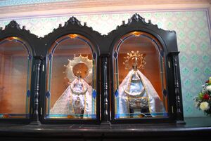 The sanctuary to this Virgin manifestation was established in 1594, with the first church built between then and 1666.[37] The church has suffered damage on various occasions from lightning strikes and from earthquakes.[38] Before the Spanish, the pyramid was considered to be sacred to a female rain deity called Chiconahuiquiahuita (Nine Rains). She was accredited with striking the new church with lightning and supposedly a stone image of her was found at the site the church is now.[32] The lightning strikes have caused minor damage, but the earthquakes have been more serious. In 1864, the church was almost completely destroyed by an earthquake. It took ten years to rebuild and was re-inaugurated in 1873.[38] In February 1930, there was a robbery at the church. The thieves stole the jewelry that the image had been wearing, including a gold crown, a silver halo and precious stones.[39] The next major quake to damage the building came in 1999, which damaged the towers and caused the pilgrims' portal to collapse, with damage to 80% of the building.[38] However, the image of the Virgin, in her Fabergé box, was undamaged.[3]