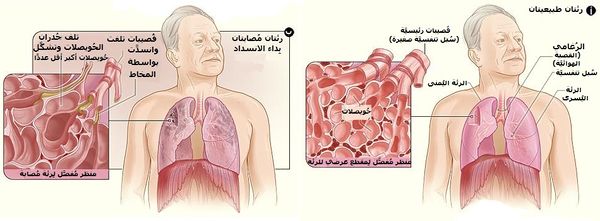 يوجد إلى اليمين رسم تخطيطي للرئتين والشعب الهوائية مع مقطع يظهر مقطعاً عرضياً مفصلاً لشعيبات الهوائية وحويصلات هوائية طبيعية. إلى اليسار ثمة رئتان تضررتا من مرض الانسداد الرئوي المزمن مع مقطع يظهر مقطعاً عرضياً لشعب هوائية وحويصلات هوائية تالفة
