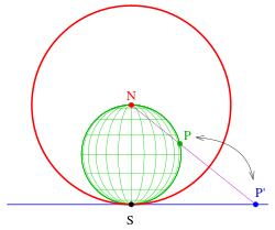A stereographic projection usually projects a sphere from a point (north pole) of the sphere onto the tangent plane at the opposite point (south pole). This mapping can be performed by an inversion of the sphere onto its tangent plane. If the sphere (to be projected) has the equation (alternately written ; center , radius , green in the picture), then it will be mapped by the inversion at the unit sphere (red) onto the tangent plane at point . The lines through the center of inversion (point ) are mapped onto themselves. They are the projection lines of the stereographic projection.