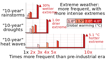 يتوقع تقرير التقييم السادس للجنة الدولية للتغيرات المناخية، الصادر في عام 2021، زيادات متزايدة في كل من تكرار (الأعمدة الأفقية) وشدة (الأعمدة العمودية) الظواهر الجوية المتطرفة، مع زيادة درجات التغير المناخ العالمي، بما في ذلك زيادة أكثر من 5 درجات مئوية في حالات الحر الشديد لزيادة متوسط درجة الحرارة العالمية بمقدار 4 درجات مئوية.[33]