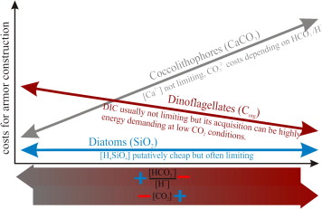 The diagram on the right is a representation of how the comparative energetic effort for armor construction in diatoms, dinoflagellates and coccolithophores appear to operate. The frustule (diatom shell) seems to be the most inexpensive armor under all circumstances because diatoms typically outcompete all other groups when silicate is available. The coccosphere is relatively inexpensive under sufficient [CO2], high [HCO3−], and low [H+] because the substrate is saturating and protons are easily released into seawater.[80] In contrast, the construction of thecal elements, which are organic (cellulose) plates that constitute the dinoflagellate shell, should rather be favored at high H+ concentrations because these usually coincide with high [CO2]. Under these conditions dinoflagellates could down-regulate the energy-consuming operation of carbon concentrating mechanisms to fuel the production of organic source material for their shell. Therefore, a shift in carbonate chemistry conditions toward high [CO2] may promote their competitiveness relative to coccolithophores. However, such a hypothetical gain in competitiveness due to altered carbonate chemistry conditions would not automatically lead to dinoflagellate dominance because a huge number of factors other than carbonate chemistry have an influence on species composition as well.[86][91]
