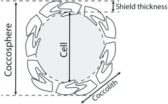 Each coccolithophore encloses itself in a protective shell of coccoliths, calcified scales which make up its exoskeleton or coccosphere.[73] The coccoliths are created inside the coccolithophore cell and while some species maintain a single layer throughout life only producing new coccoliths as the cell grows, others continually produce and shed coccoliths.