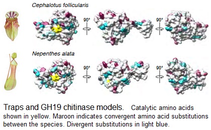 Carnivory has evolved multiple times independently in plants in widely separated groups. In three species studied, Cephalotus follicularis, Nepenthes alata and Sarracenia purpurea, there has been convergence at the molecular level. Carnivorous plants secrete enzymes into the digestive fluid they produce. By studying phosphatase, glycoside hydrolase, glucanase, RNAse and chitinase enzymes as well as a pathogenesis-related protein and a thaumatin-related protein, the authors found many convergent amino acid substitutions. These changes were not at the enzymes' catalytic sites, but rather on the exposed surfaces of the proteins, where they might interact with other components of the cell or the digestive fluid. The authors also found that homologous genes in the non-carnivorous plant Arabidopsis thaliana tend to have their expression increased when the plant is stressed, leading the authors to suggest that stress-responsive proteins have often been co-opted[ت] in the repeated evolution of carnivory.[64]