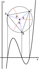 Viète's trigonometric expression of the roots in the three-real-roots case lends itself to a geometric interpretation in terms of a circle.[22][26] When the cubic is written in depressed form , as shown above, the solution can be expressed as