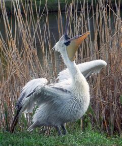 Among a highly social family in general, Dalmatian pelicans may have the least social inclinations. This species naturally nests in relatively small groups compared to most other pelican species and sometimes may even nest alone. However, small colonies are usually formed, which regularly include upwards of 250 pairs (especially historically). Occasionally, Dalmatian pelicans may mix in with colonies of great white pelicans.[5] Nesting sites selected are usually either islands in large bodies of water (typically lagoons or river deltas[7]) or dense mats of aquatic vegetation, such as extensive reedbeds of Phragmites and Typha. Due to their large size, these pelicans often trample the vegetation in the area surrounding their nests into the muddy substrate and thus nesting sites may become unsuitably muddy after around three years of usage.[9]
