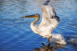 The Dalmatian pelican is one of the species to which the Agreement on the Conservation of African-Eurasian Migratory Waterbirds (AEWA) applies. Conservation efforts have been undertaken on behalf of the species, especially in Europe.[9] Although they normally nest on the ground, Dalmatian pelicans have nested on platforms put out in Turkey, Greece, Bulgaria and Romania in order to encourage them to breed.[5] Rafts over water have also been set up for the species to use in Greece and Bulgaria.[9] Power-lines have also been marked or dismantled in areas adjacent to colonies in these countries. Additionally, water-level management and educational programs may be aiding them at a local level.[9] Although efforts have been undertaken in Asia, there is a much higher rate of poaching, shooting and habitat destruction there, which may make conservation efforts more difficult.[17] In 2012, when unusually frigid winter conditions caused the Caspian Sea to freeze over, it resulted in the death from starvation of at least twenty of the Dalmatian pelicans that overwinter there. Despite local authorities' initial attempts to discourage it, many people there turned out with fish and hand-fed the birds, apparently enabling the huge pelicans to survive the winter.[19]