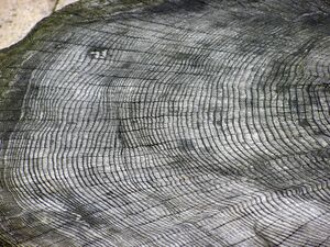 New growth in trees occurs in a layer of cells near the bark. A tree's growth rate changes in a predictable pattern throughout the year in response to seasonal climate changes, resulting in visible growth rings. Each ring marks a complete cycle of seasons, or one year, in the tree's life.[3] As of 2023, securely dated tree-ring data for Germany, Bohemia and Ireland are available going back 13,910 years.[4][5][6] A new method is based on measuring variations in oxygen isotopes in each ring, and this 'isotope dendrochronology' can yield results on samples which are not suitable for traditional dendrochronology due to too few or too similar rings.[7] Some regions have "floating sequences", with gaps which mean that earlier periods can only be approximately dated. As of 2024, only three areas have continuous sequences going back to prehistoric times, the foothills of the Northern Alps, the southwestern United States and the British Isles. Miyake events, which are major spikes in cosmic rays at known dates, are visible in trees rings and can fix the dating of a floating sequence.[8]