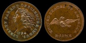 إصدار عام 1796 من عملة الدايم بصورة السيدة ليبرتي على الوجه الأمامي وصورة النسر الصغير على الوجه الخلفي للعملة عملة دايم تعود إلى عام 1800 حيث استبدل النسر الصغير بنسر هيرالدي كبير