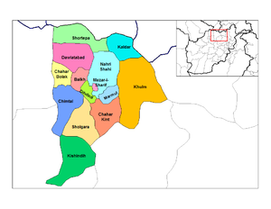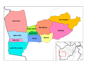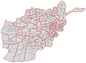 هذه هي قائمة مديريات (أو مقاطعات) أفغانستان، وتُعرف بإسم وُلـِسْوالي (Pashto: ولسوالۍ؛ فارسية: ولسوالی، شهرستان). These are secondary level administrative units, one level below the provinces. The Afghan government issued its first district map in 1973.[1][2] It recognized 325 districts, counting wuleswalis (districts), alaqadaries (sub-districts), and markaz-e-wulaiyat (provincial center districts).[2] In the ensuing years additional districts have been added through splits, and a few eliminated through mergers. In June 2005, the Afghan government issued a map of 398 districts.[3] It was widely adopted as by many information management systems, though usually with the addition of Sharak-e-Hayratan for a 399 district total. Here is a link to a clean rendering of the 399 district set as a spreadsheet from an official Afghan source.[4] It remains the de facto standard, as of late 2018, despite a string of government announcements of the creation of new districts.