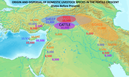 - ^ Zeder, Melinda A. (19 August 2008). "Domestication and early agriculture in the Mediterranean Basin: Origins, diffusion, and impact". Proceedings of the National Academy of Sciences. 105 (33): 11597–11604, Fig.1. doi:10.1073/pnas.0801317105.
