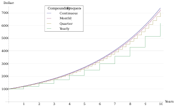 The effect of earning 20% annual interest on an initial $1,000 investment at various compounding frequencies