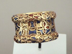 The artifacts found in the royal tombs of the First Dynasty of Ur indicate that foreign trade was particularly active during this period, with many materials coming from foreign lands, such as Carnelian likely coming from the Indus or Iran, Lapis Lazuli from Afghanistan, silver from Turkey, copper from Oman, and gold from several locations such as Egypt, Nubia, Turkey or Iran.[48] Carnelian beads from the Indus were found in Ur tombs dating to 2600–2450, in an example of Indus-Mesopotamia relations.[49] In particular, carnelian beads with an etched design in white were probably imported from the Indus Valley, and made according to a technique developed by the Harappans.[47] These materials were used in the manufacture of ornamental and ceremonial objects in the workshops of Ur.[48]