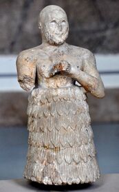 Also recovered in conjunction with these temples were 87 alabaster figures of worshippers, ranging in height from 20 to 65 centimeters (8 to 26 inches), depicting both men and women.[47] The style of these figures resembles Sumerian figures of the ED II and ED III periods. One of the early figures found at Assur is a head of a female figure, wearing a fillet. This head is typical of the art style of the Akkadian period, with smooth and soft curves and a full mouth. As it was found in association with the Ishtar G temple, it indicates that the temple continued to be used well into the Akkadian period as well.[48] In addition to the alabaster figures of worshippers, also recovered were 24 stone statues of naked women, five statues of animals, a number of incense burners/pot stands and three large clay altars or house models.[47] A unique figure among the recovered finds was an ivory figurine of a nude woman, alongside fragments of at least five additional similar figurines. The ivory used might have come from Indian elephants, which would indicate trade between Assur and the early tribes and states of Iran. Also found among the artefacts of Ishtar G are a clay bottle with the features of a nude woman as well as a figurine of a man with an erect penis.[48]